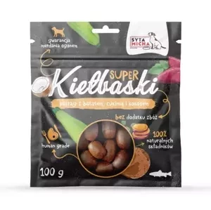 Super kiełbaski dla psa z pstrągiem, batatem, cukinią i kokosem Syta Micha