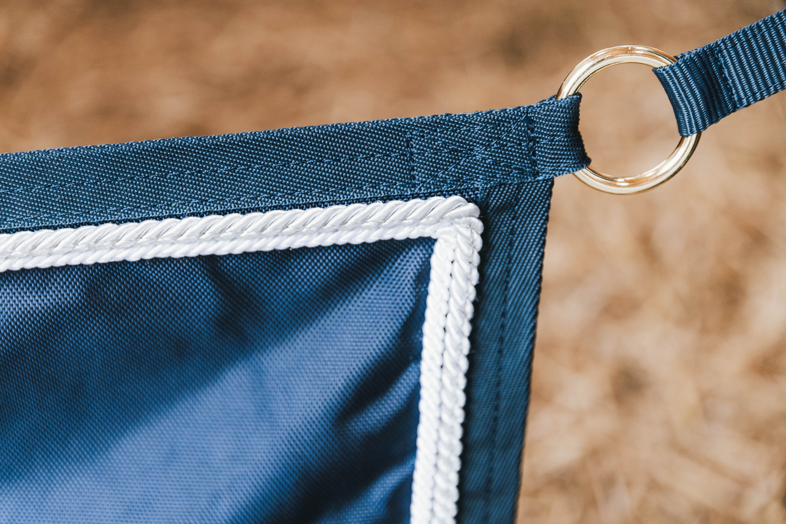 Dodatkowe dwa wzmocnione okręgi w dolnych rogach pozwalają na pełne unieruchomienie, aby bramka nie kołysała się pod wpływem ruchów konia czy przeciągów.