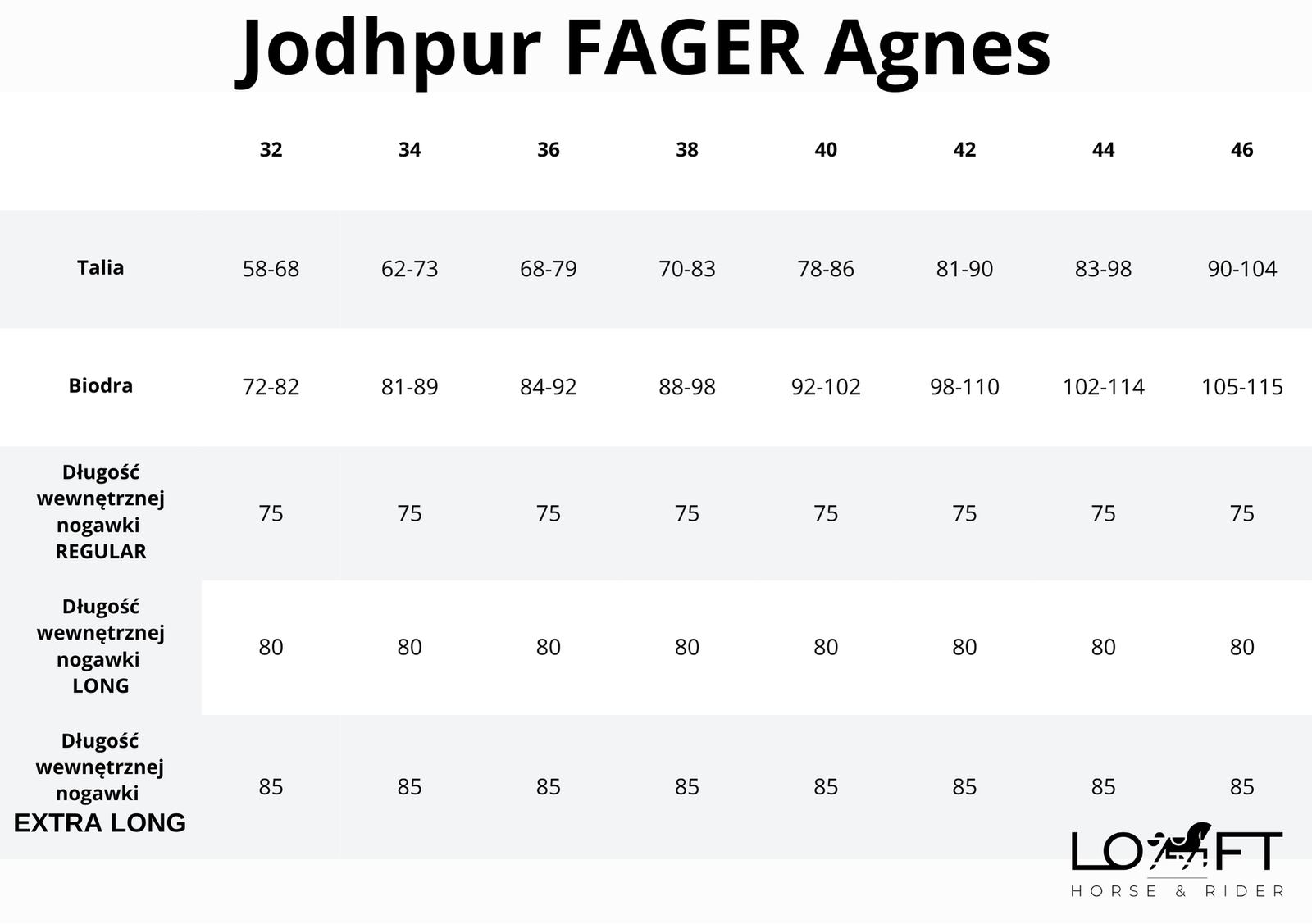 Bryczesy są nieco większe niż standardowe rozmiary – w przypadku wahania między dwoma rozmiarami, zalecamy wybór mniejszego.