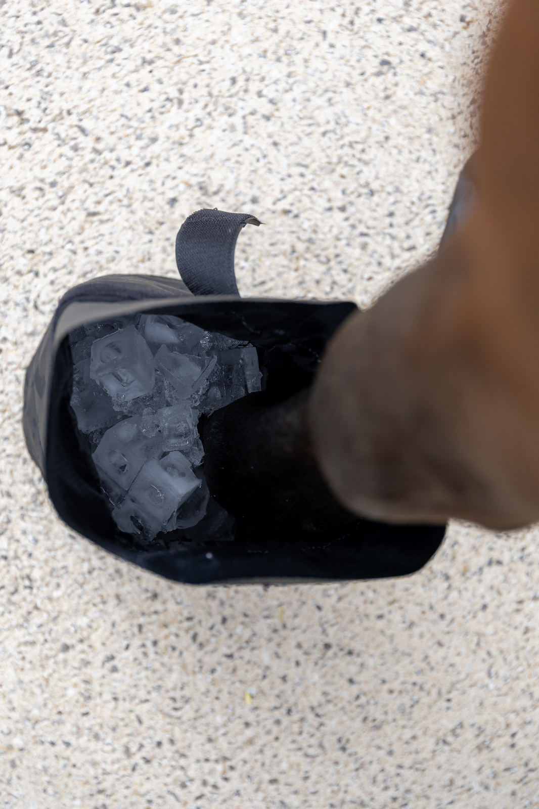 Buty wykonano z trwałego, wodoodpornego materiału zewnętrznego, który umożliwia stosowanie ich z lodem, zimną wodą lub mokrymi opatrunkami bez ryzyka przesiąkania. Dzięki temu doskonale sprawdzają się jako buty chłodzące po wysiłku, pomagając zmniejszyć obciążenie struktur kopyta, pęciny i stawu pęcinowego oraz wspierając regenerację po intensywnej pracy. Jednocześnie mogą pełnić funkcję ochronną, zabezpieczając kopyto przed zabrudzeniem i wilgocią w trakcie leczenia lub przy konieczności założenia opatrunku.