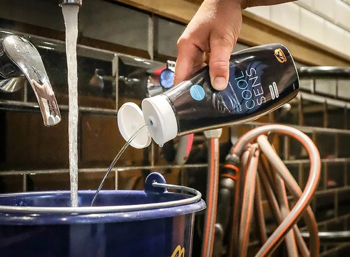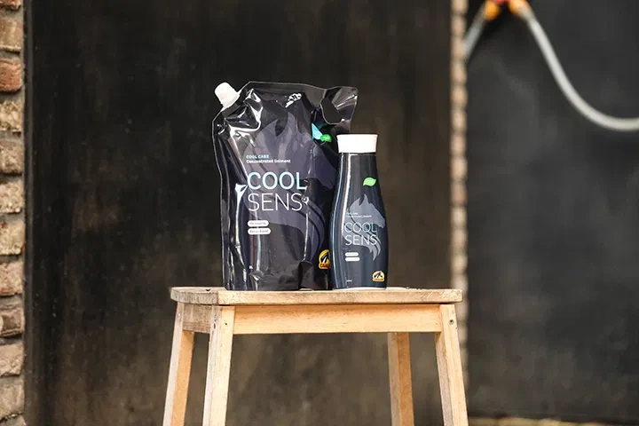 Rozcieńcz CoolSens w zimnej lub letniej wodzie, dobierając stężenie według własnych preferencji. Nanieś roztwór na ciało konia za pomocą gąbki, ze szczególnym uwzględnieniem grzbietu i nóg. Nie spłukuj – po zabiegu użyj ściągaczki do potu i usuń nadmiar wody, pozostawiając produkt do wyschnięcia na sierści.