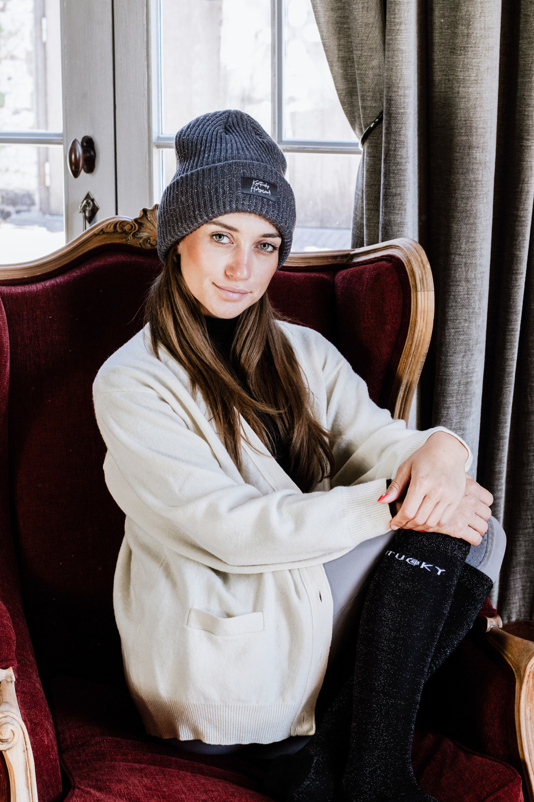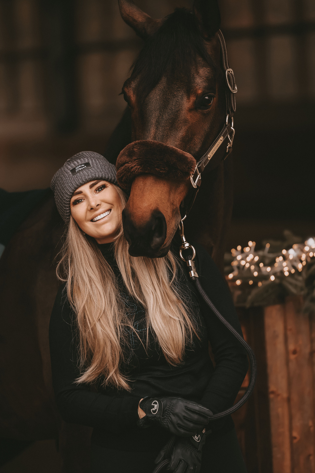 Modna i ciepła zimowa czapka z błyszczącym wykończeniem. To idealna czapka na chłodne dni w stajni, spacery po padoku, zimowe treningi oraz codzienne aktywności — od miejskich wyjść po wyjazdy na zawody.