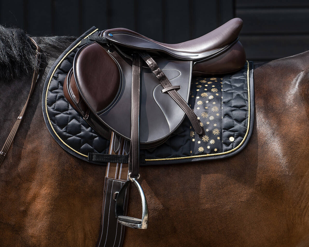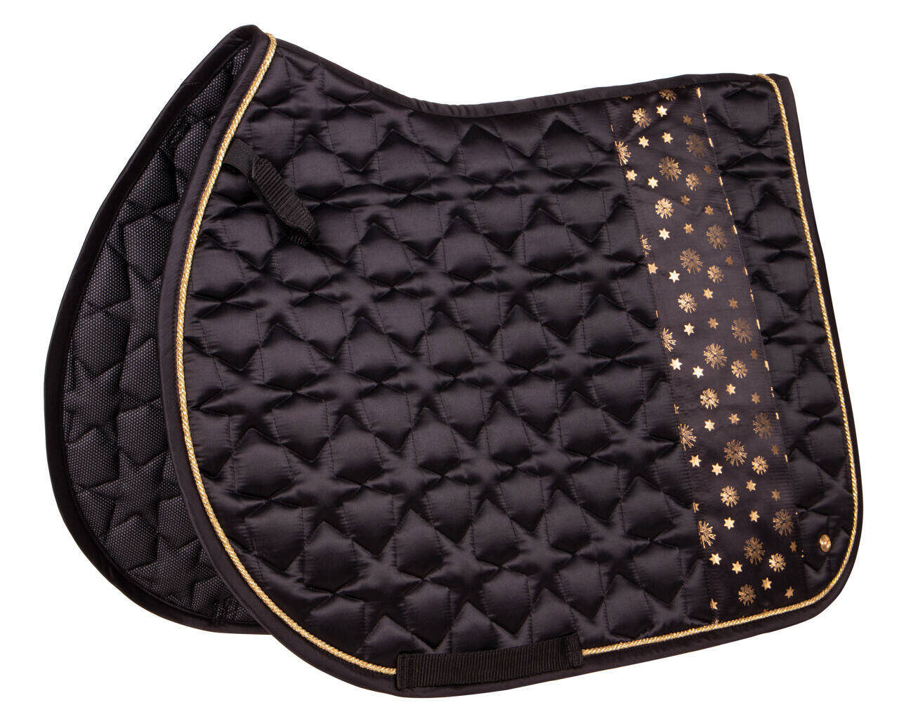 - Czarny satynowy czaprak ozdobiony złotymi detalami i ozdobiony nadrukiem gwiazdy. Idealnie sprawdzi się do świąteczno-sylwestrowych sesji zdjęciowych!