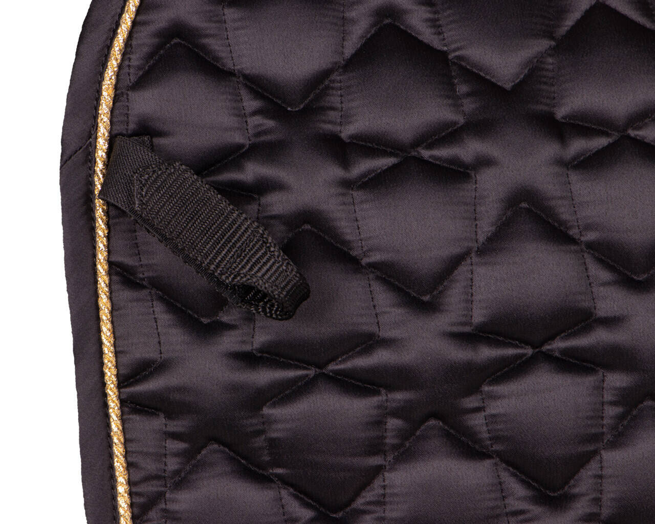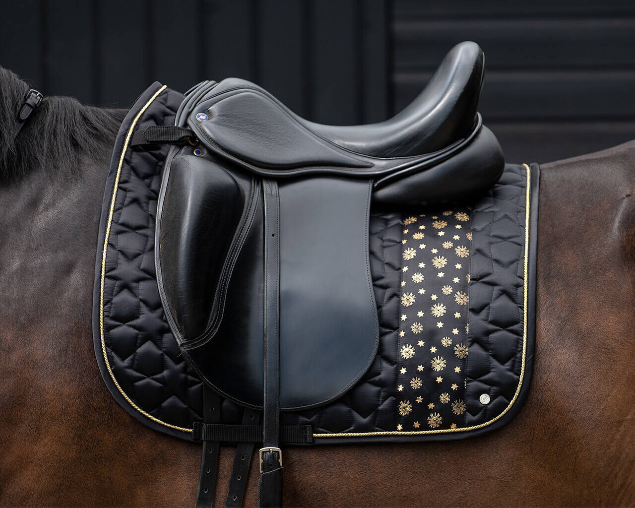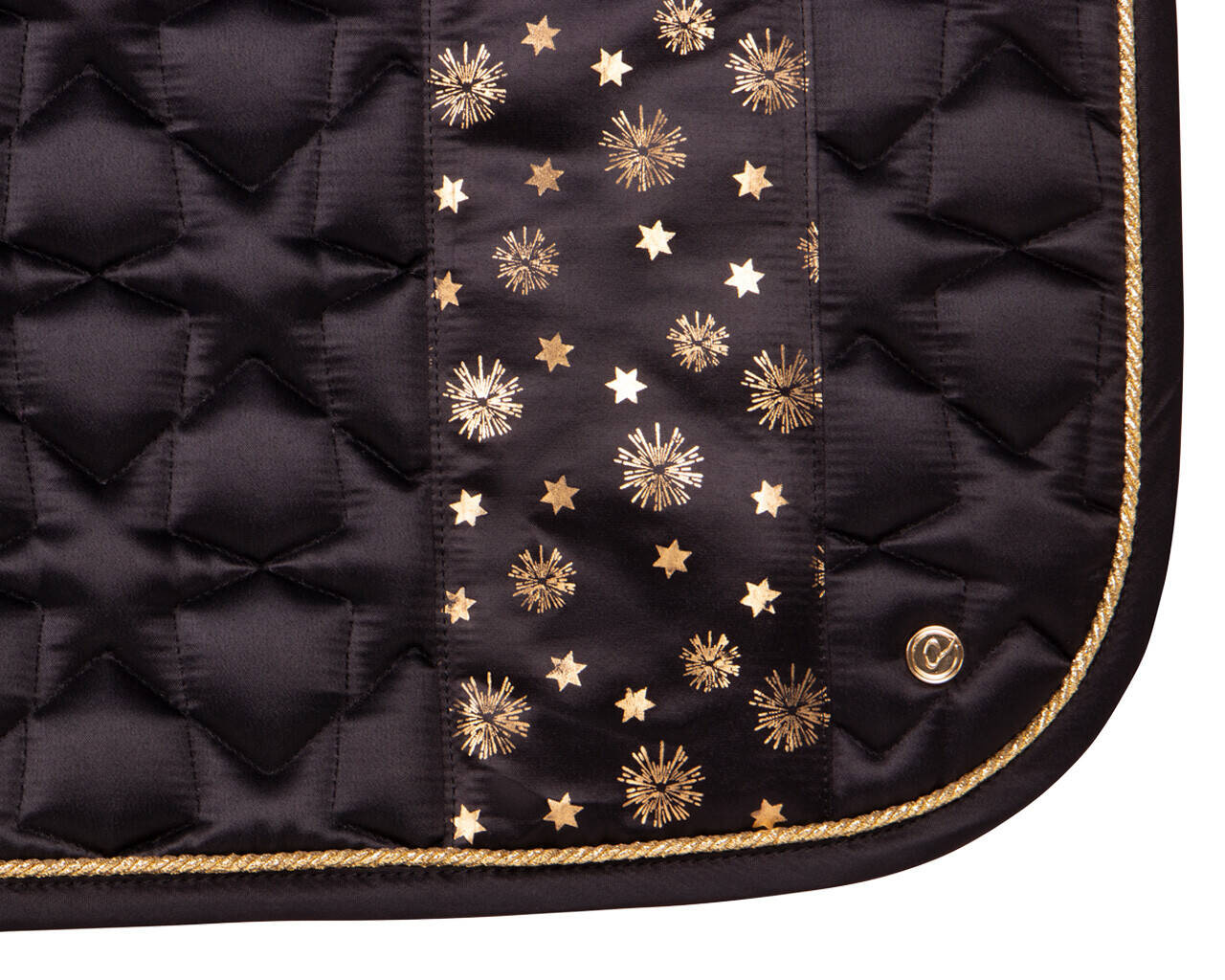 Czarny satynowy czaprak ozdobiony złotymi detalami i ozdobiony nadrukiem gwiazdy.