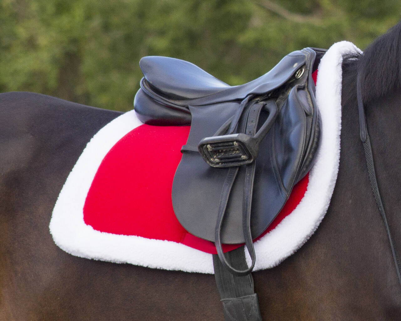 Świąteczny czaprak w czerwonym kolorze, wykończony lamówką z białego futerka.