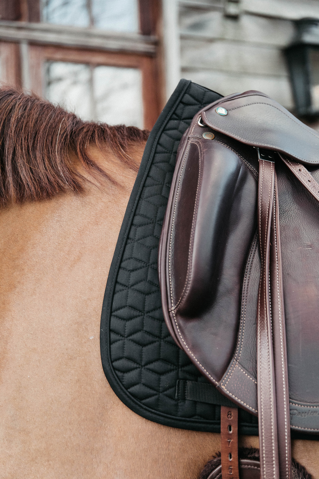 Od wewnątrz zastosowano oddychającą podszewkę z mieszanki bawełny i poliestru o właściwościach odprowadzających wilgoć. Taki skład sprzyja szybkiemu transportowi potu na zewnątrz, ogranicza przegrzewanie się pleców konia i pomaga utrzymać stabilne warunki termiczne podczas jazdy. Dobrze wentylowana powierzchnia pod siodłem znacząco zmniejsza ryzyko otarć, podrażnień i napięć mięśniowych.