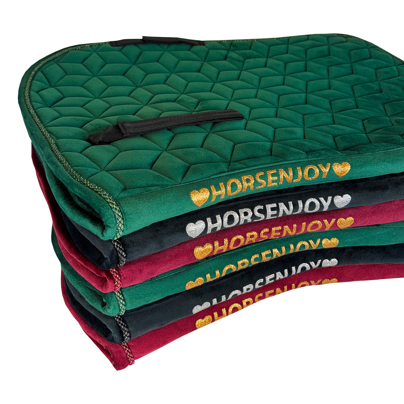 Aksamit jest nie tylko efektowny, ale też przyjemny w dotyku i funkcjonalny. Dzięki gęstej, miękkiej strukturze materiał łagodzi nacisk pod siodłem i poprawia komfort konia. Ma anatomiczny kształt – tak, aby naturalnie układał się na grzbiecie konia i nie powodował ucisku w newralgicznych miejscach.