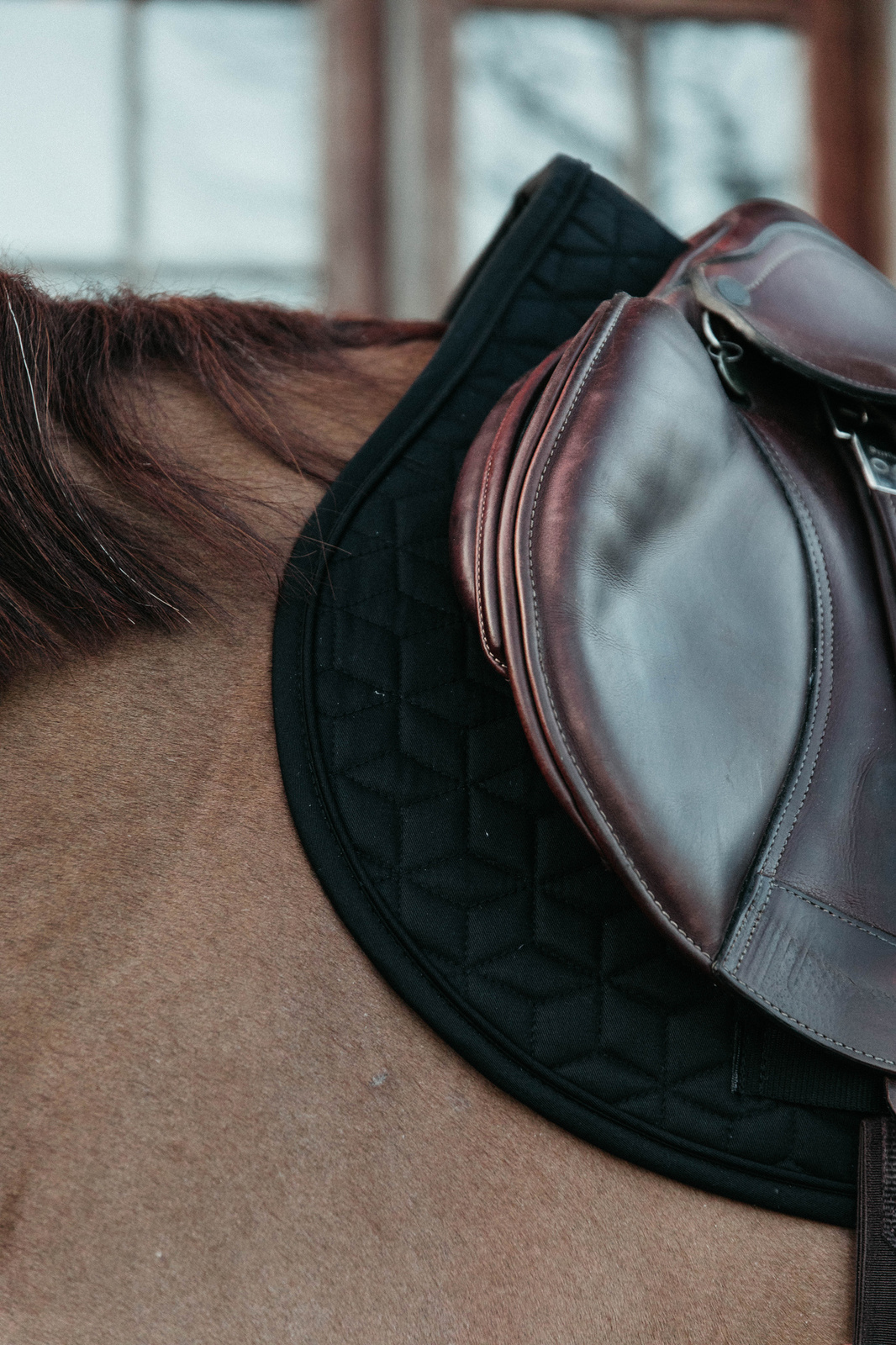 Od wewnątrz zastosowano oddychającą podszewkę z mieszanki bawełny i poliestru o właściwościach odprowadzających wilgoć. Taki skład sprzyja szybkiemu transportowi potu na zewnątrz, ogranicza przegrzewanie się pleców konia i pomaga utrzymać stabilne warunki termiczne podczas jazdy. Dobrze wentylowana powierzchnia pod siodłem znacząco zmniejsza ryzyko otarć, podrażnień i napięć mięśniowych.