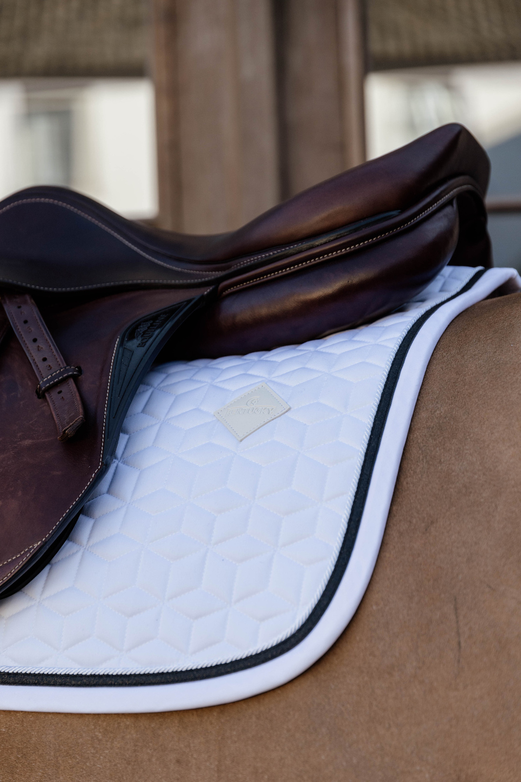 Czaprak nie posiada klasycznych pasków do siodła, zamiast tego zastosowano jedynie solidny, nylonowy pasek do popręgu, co poprawia stabilność.