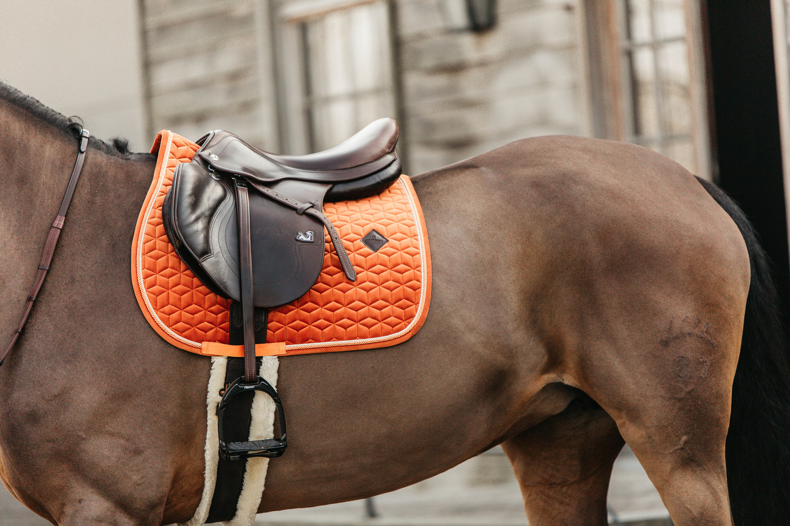 Model nie posiada pasków do siodła – zastosowano jedynie nylonowy pasek do popręgu, co poprawia wygodę użytkowania, skraca czas siodłania i eliminuje nieestetyczne fałdowanie materiału.