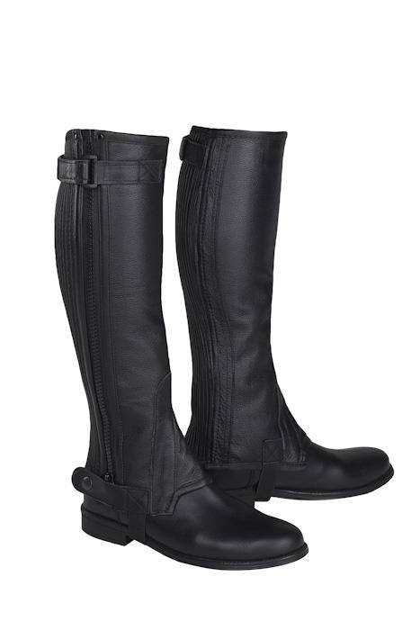 Czapsy wykonane z miękkiej skóry licowej. Posiadają elastyczną wstawkę na całej długości, górne zapięcie na rzep oraz dolne na zatrzask.