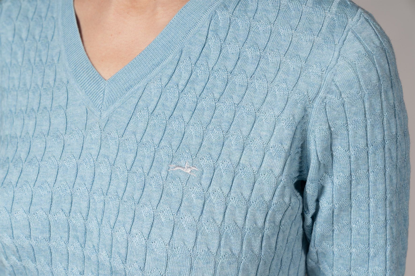Model zachwyca tradycyjnym wzorem oraz kobiecym dekoltem w kształcie litery V, dzięki czemu doskonale sprawdza się zarówno w stajni, jak i do noszenia na co dzień. Świetnie sprawdzi się jako warstwa pod kamizelkę, kurtkę lub płaszcz, a jego klasyczny krój pozwala dopasować go do większości stylizacji.