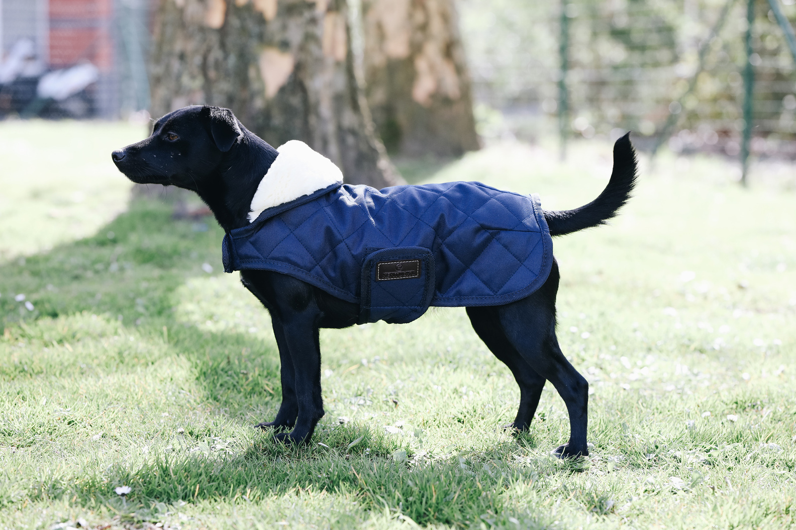 Na wysokości szyi znajduje się kołnierz z miękkiej imitacji owczej wełny, który można odwinąć, aby osłonić kark psa w szczególnie wietrzne dni.