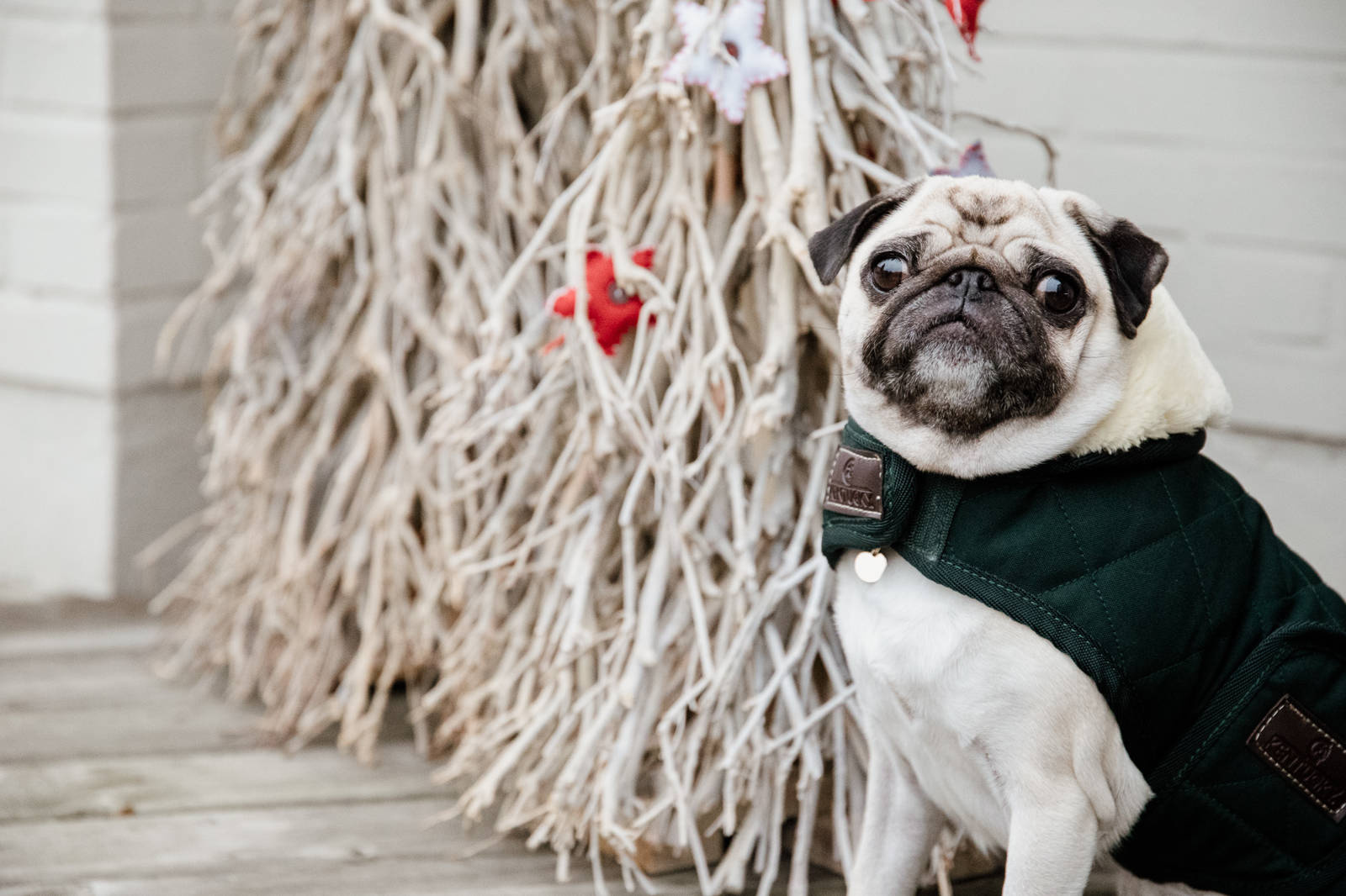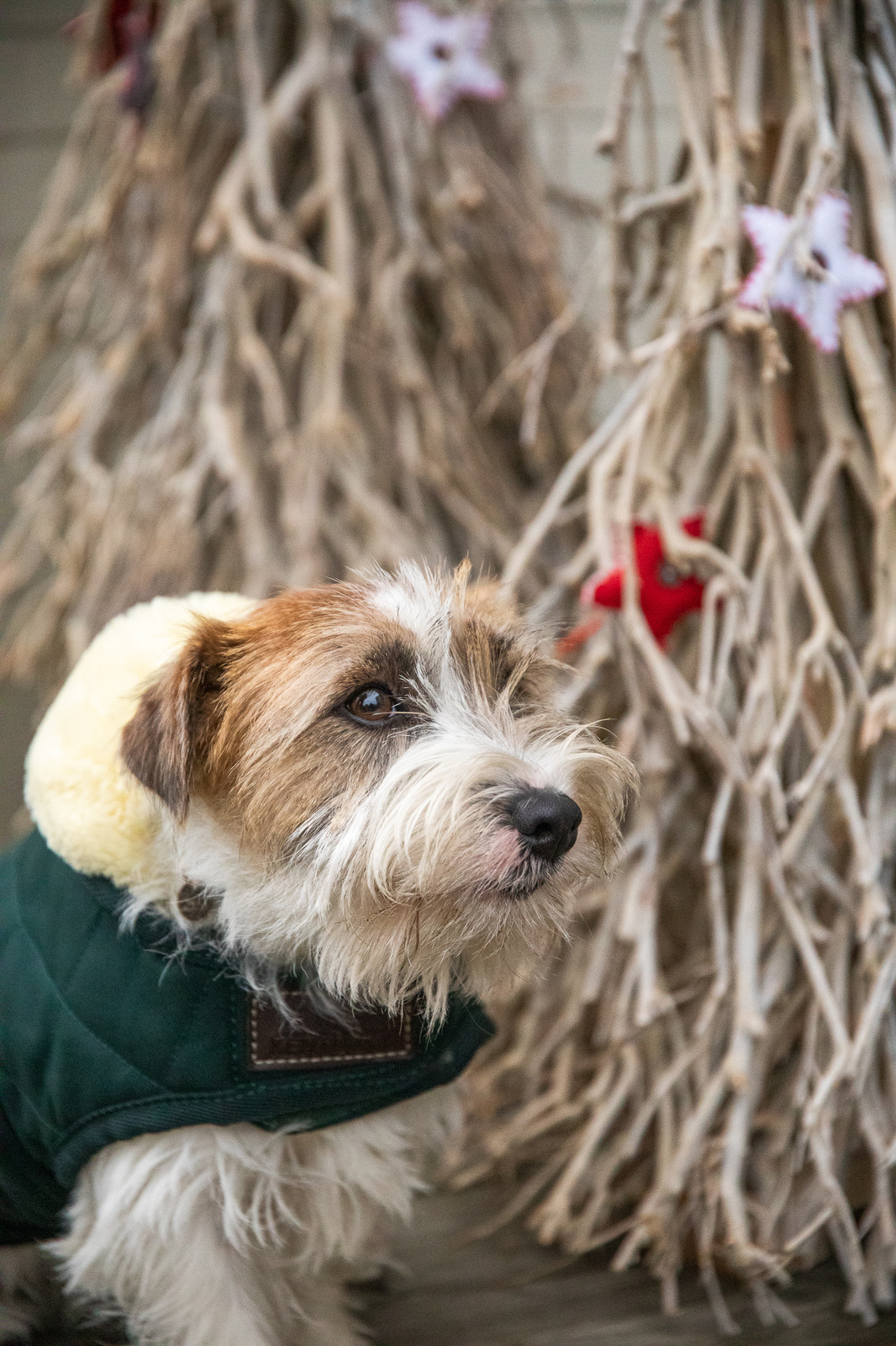 Na wysokości szyi znajduje się kołnierz z miękkiej imitacji owczej wełny, który można odwinąć, aby osłonić kark psa w szczególnie wietrzne dni.