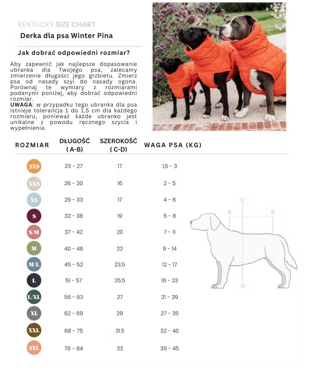 Jeśli pies nosił już inne derki marki Kentucky, zaleca się wybór o jeden rozmiar większy w przypadku modelu Winter Pina.