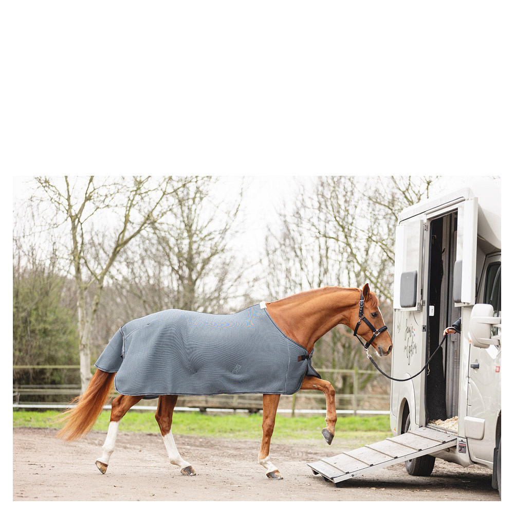Derka wykonana jest z lekkiego i oddychającego materiału, który skutecznie zapobiega przegrzaniu grzbietu konia, jednocześnie chroniąc go przed przewianiem. Dzięki swojej lekkości i przewiewności idealnie sprawdza się w roli derki transportowej, a także jako derka potreningowa lub stajenna na chłodniejsze noce.