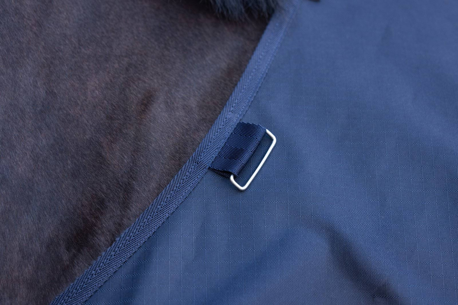Derka wyposażona jest w klapę na ogon, krzyżujące się pasy pod brzuchem oraz paski na nogi, które stabilizują pozycję derki nawet podczas zabawy na padoku. Poduszka kłębu z syntetycznego kauczuku zapobiega otarciom, a szeroki przód zapinany jest na zachodzące na siebie pasy z karabińczykiem i metalowymi sprzączkami.