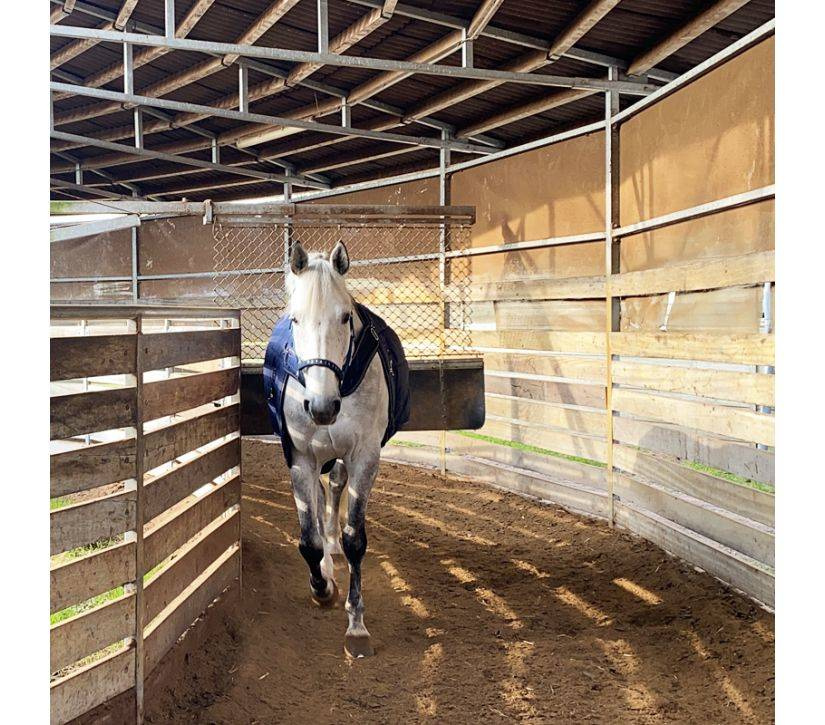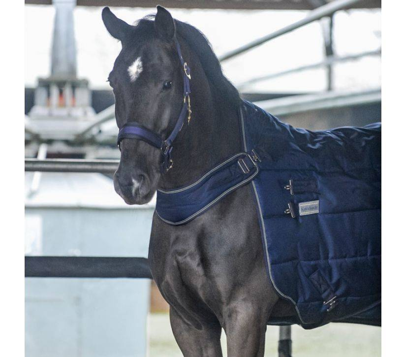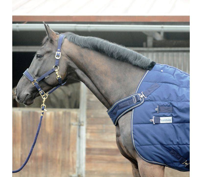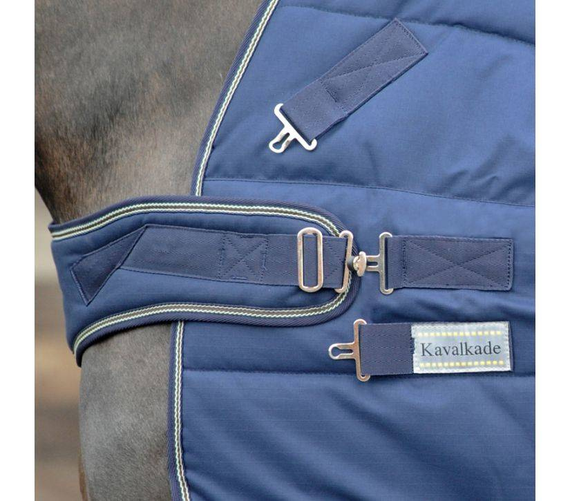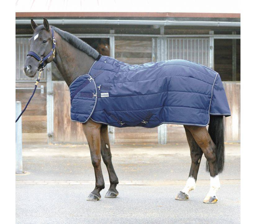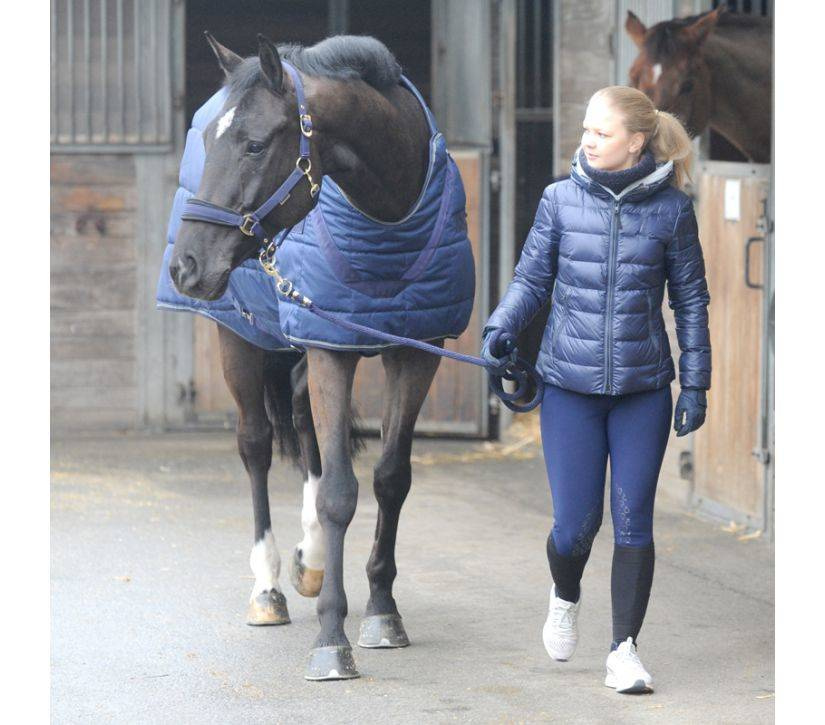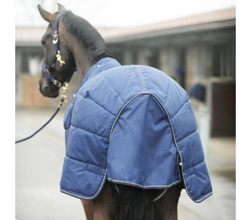 • Wykonana z materiałów wysokiej jakości, z wypełnieniem 400 gram. Dzięki szybkiej i łatwej wymianie paska piersiowego może być używana zarówno jako derka stajenna, jak i derka do karuzeli.