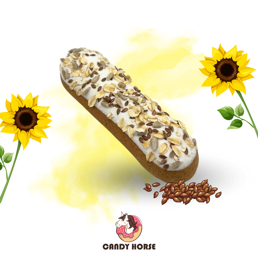 Zbożowe ciasteczko w kształcie eklera dekorowane ręcznie, z najwyższą starannością i uwagą.