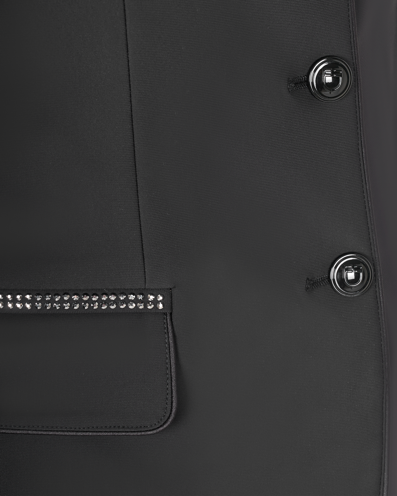 Największym atutem tego modelu jest wyjątkowe wykończenie kołnierza i kieszeni, ozdobionych kryształkami. Te efektowne detale dodają frakowi luksusowego charakteru, sprawiając, że wyróżnisz się na czworoboku czy parkurze.