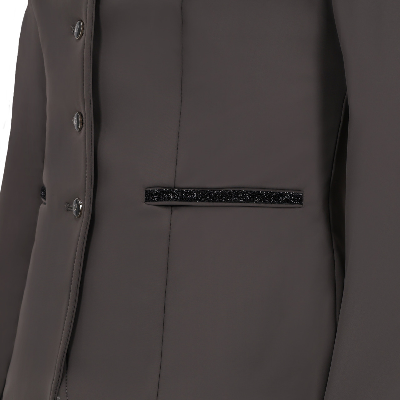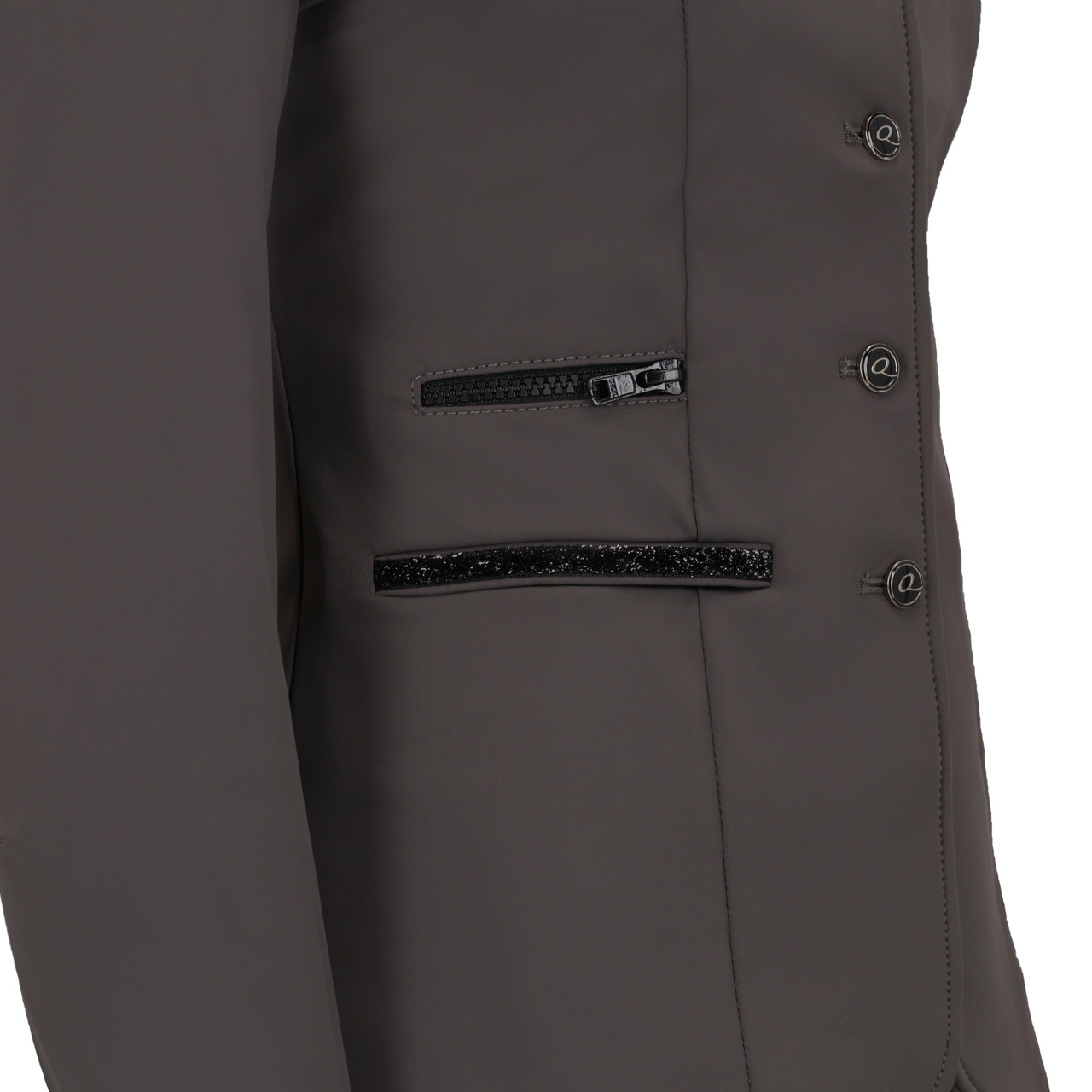 Frak jest ozdobiony brokatową taśmą na dwóch kieszeniach zapinanych na suwak.