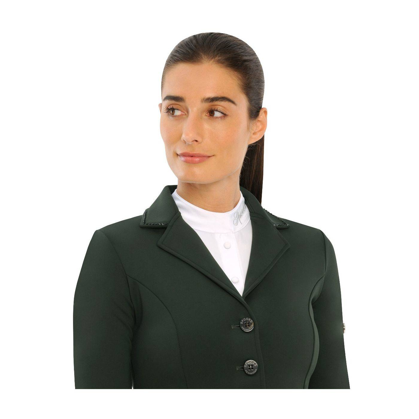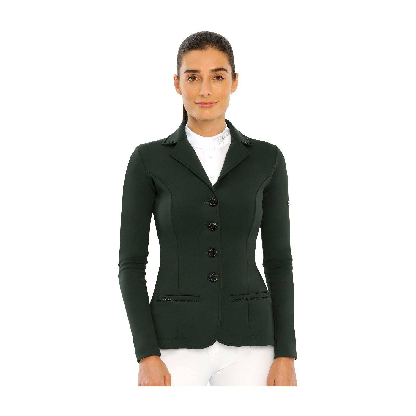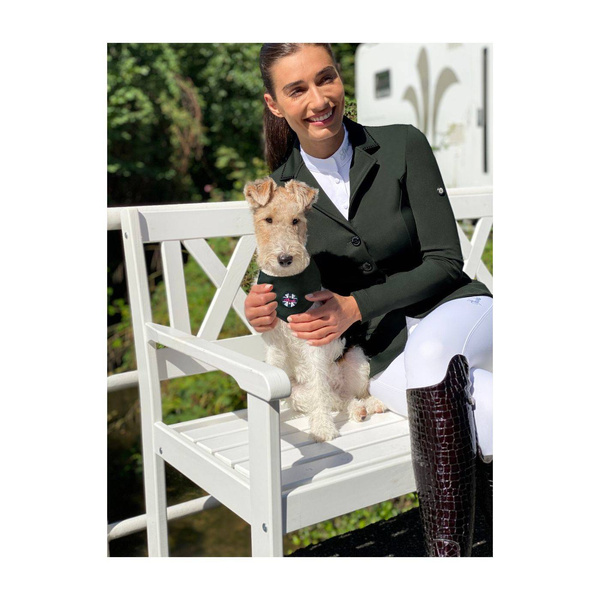 Zdobiony kryształkami w kolorze materiału - przy kołnierzyku oraz kieszonkach oraz z tyłu przy rozcięciach.