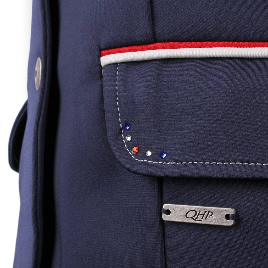 Ma trójkolorowy motyw na kołnierzu, kieszeniach i plecach oraz ozdobne kryształki na klapach, kieszeniach i rozcięciach.