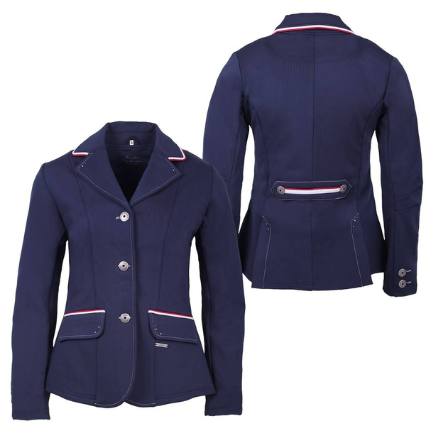 Ma trójkolorowy motyw na kołnierzu, kieszeniach i plecach oraz ozdobne kryształki na klapach, kieszeniach i rozcięciach.