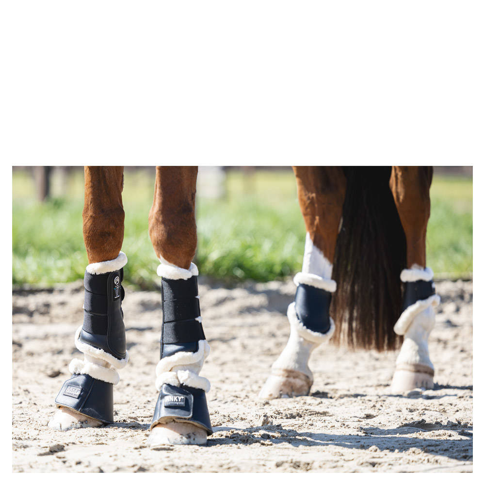 - Techniczne kaloszki z wyściółką wykonaną z amortyzującego neoprenu. Podszewka z lekkiej, przewiewnej siateczki 3D. Ukośne zapięcie na rzep zapobiega otarciom o nogę konia.