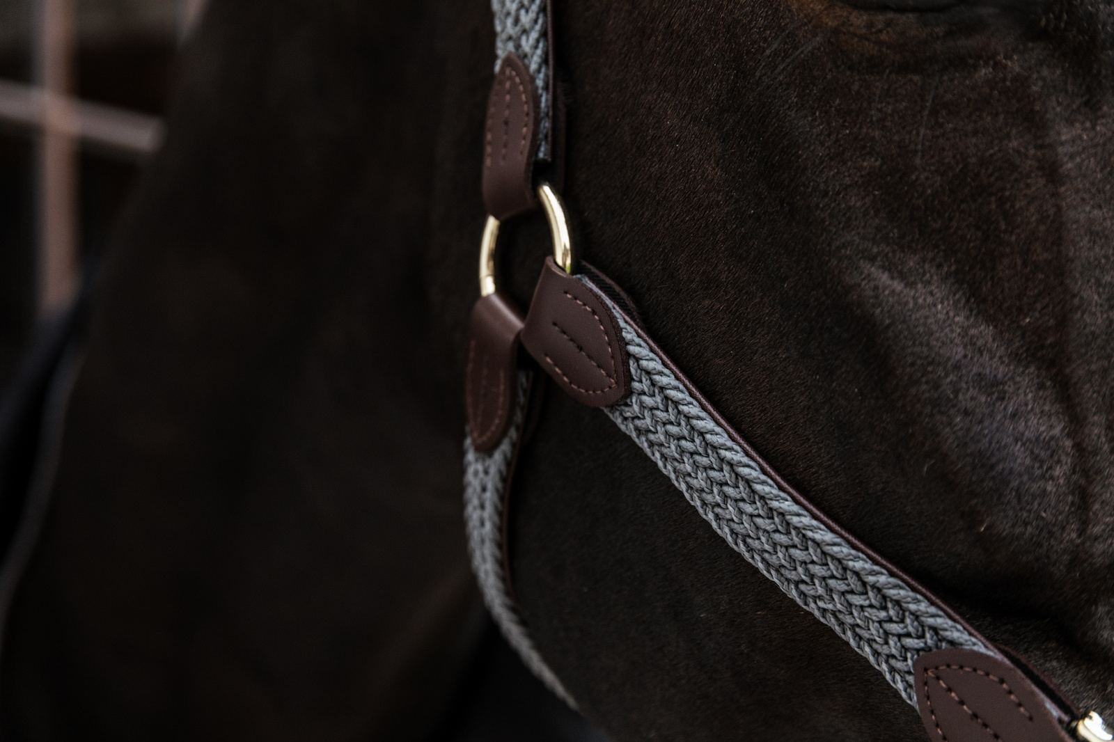 Nowoczesny kantar wykonany z wysokiej jakości skóry syntetycznej w połączeniu z eleganckim, plecionym nylonem. Materiał jest w 100% animal friendly – nie zawiera składników pochodzenia zwierzęcego, a jednocześnie pod względem użytkowym przewyższa tradycyjną skórę naturalną. Skóra syntetyczna nie chłonie wody ani brudu, nie twardnieje, nie pęka i nie zmienia koloru pod wpływem wilgoci, promieni UV czy potu konia, co w praktyce oznacza wieloletnie użytkowanie bez utraty estetyki.