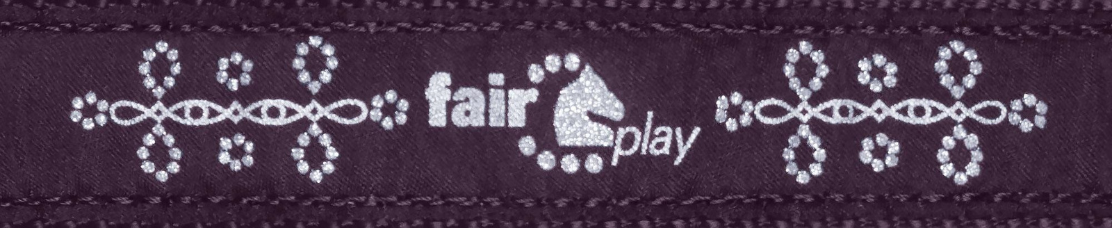 Ma eleganckie satynowane okucia w kolorze srebrnym z subtelnym logo marki Fair Play. Całość uzupełnia ozdobny nadruk z logo Fair Play na pasku nachrapnika.