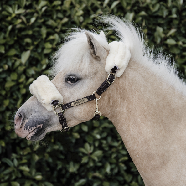 Wykonany ze sztucznej skóry - w 100% przyjaznej dla zwierząt. Nie wchłania wody ani brudu, nie pęka i nie zmienia koloru. Jest bardziej elastyczna niż prawdziwa skóra, a przez to znacznie przyjemniejsza w użyciu. Ma dwa kawałki sztucznego owczego futerka na nachrapniku i na potylicy, które można zdjąć w razie potrzeby.