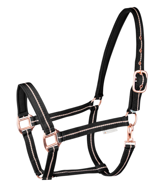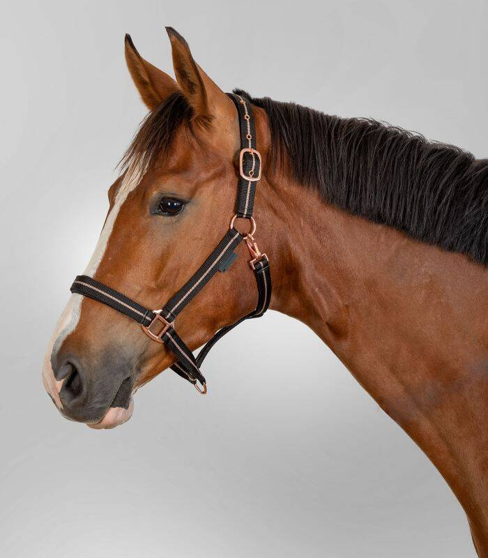 Stylowy kantar z okuciami w kolorze różowego złota, idealny zarówno na co dzień, jak i na specjalne okazje.