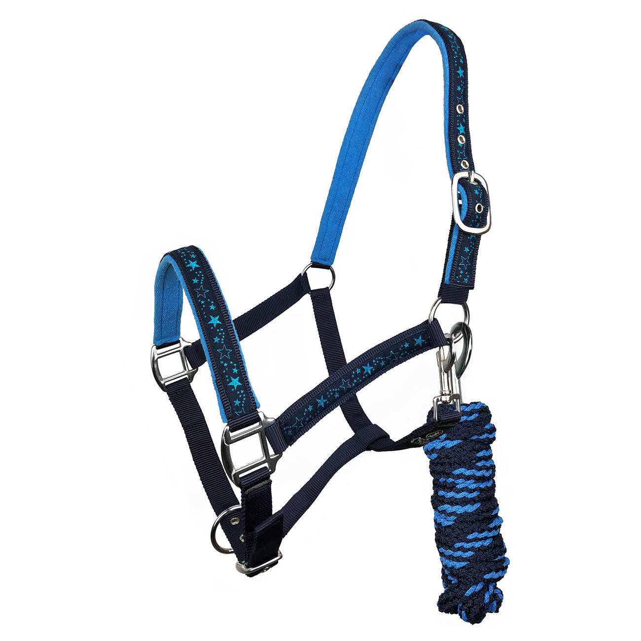 Na potylicy i nachrapniku ozdobiony taśmą w gwiazdki.