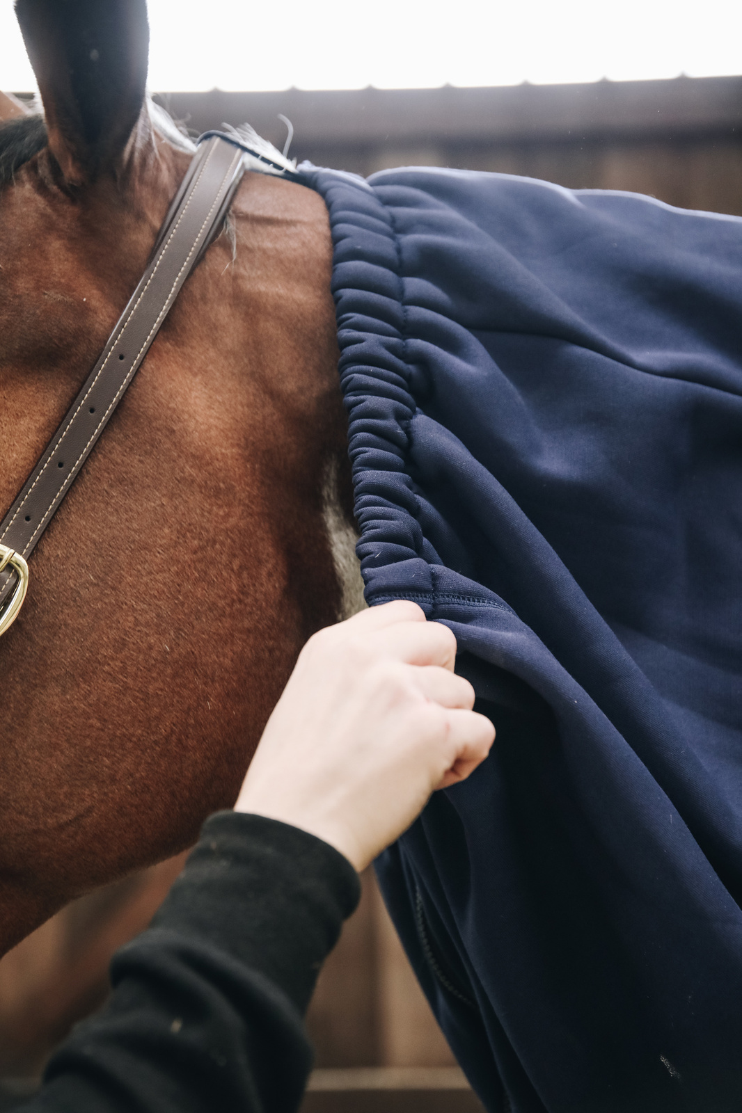 Zakładanie i zdejmowanie szalika jest wyjątkowo proste dzięki praktycznemu zamkowi błyskawicznemu umieszczonemu pod szyją. Dodatkowo niewielkie zapięcie na rzep przy potylicy pozwala przypiąć go do kantara, co stabilizuje jego pozycję nawet przy ruchliwych koniach. Elastyczna taśma na obwodzie szyi zapewnia idealne dopasowanie bez ucisku, pozwalając na pełną swobodę ruchów i zachowanie naturalnej postawy głowy.