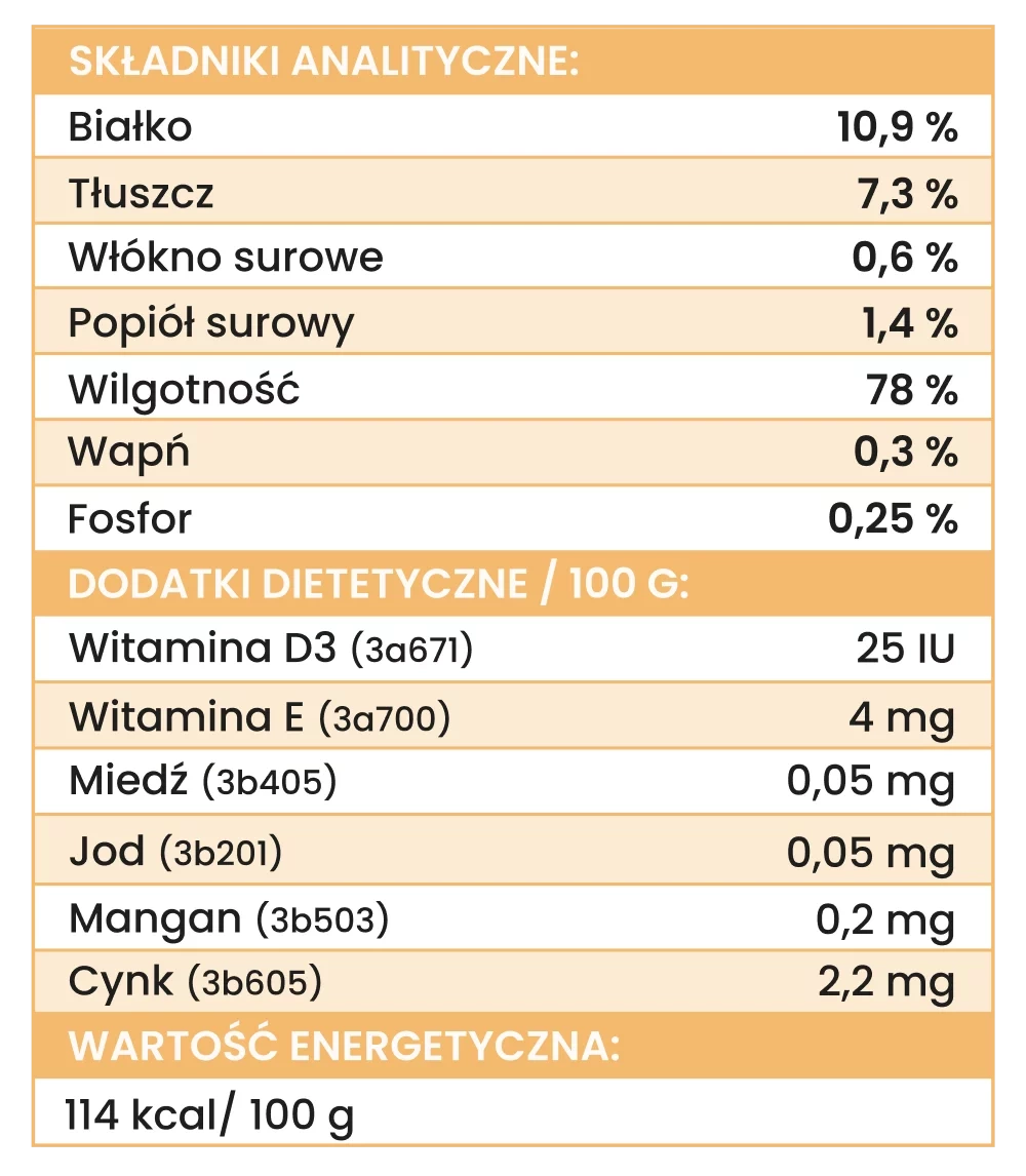 Składcielęcina (88,75 %, w tym: 74,25 % mięso mięśniowe, 14,5 % podroby: żołądki, serca, wątroba), cukinia (8 %), nasiona chia (1 %), witaminy i minerały (1 %), inulina (0, 65 %), algi morskie brunatne (0,24 %), olej z łososia (0,24 %), zioła (0,12 %, w tym: dzika róża, pokrzywa, jeżówka, kurkuma, ostropest plamisty).