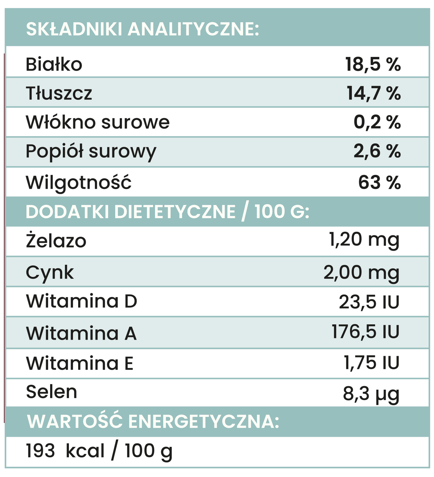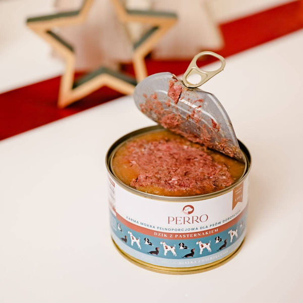 Skład: dzik - mięso mięśniowe (93,5 %), pasternak suszony (4 %), nasiona chia (1 %), suszone drożdze piwne (0,6%), wapń (0,3 %), algi morskie brunatne (0,24 %), olej z łososia (0, 24 %), zioła (0,12%, w tym: dzika róża, pokrzywa, jeżówka, kurkuma, ostropest plamisty), składniki mineralne