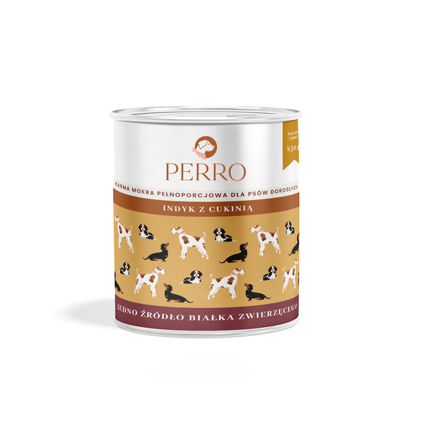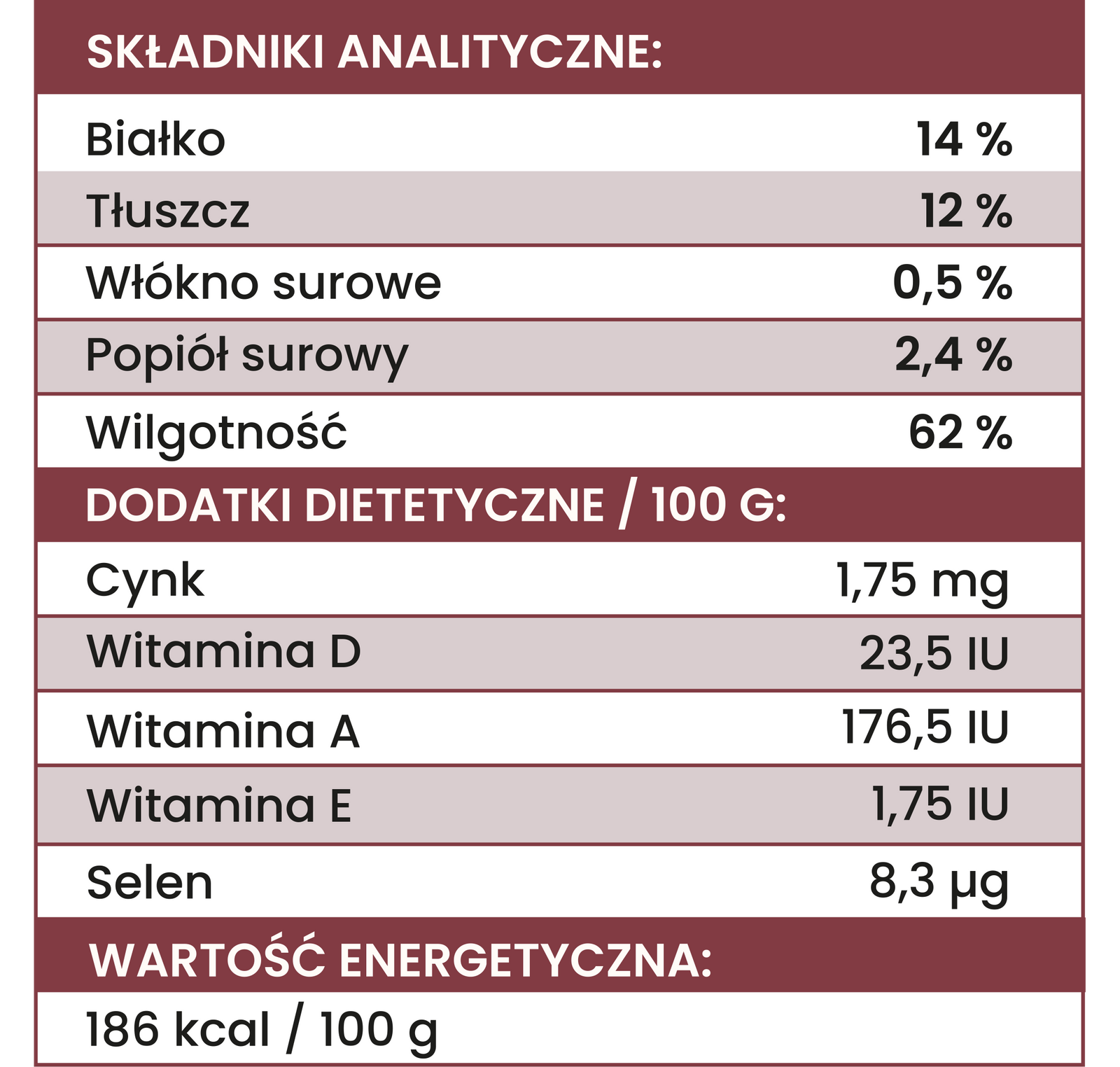 Skład: indyk (93,5 %, w tym: 75,5 % mięso mięśniowe, 18 % serca indycze), cukinia (4 %), nasiona chia (1 %), suszone drożdże piwne (0,6 %), wapń (0,3 %), algi morskie brunatne (0,24 %), olej z łososia (0,24 %), zioła (0,12 %, w tym: dzika róża, pokrzywa, jeżówka, kurkuma, ostropest plamisty), żurawina (0,12 %), składniki mineralne