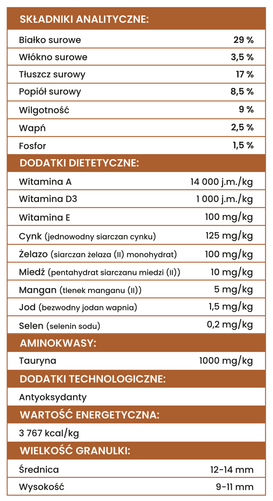 Skład: Indyk (51 %, w tym 36 % indyk suszony, 15 % indyk świeży), słodkie ziemniaki (bataty, 8 %), tłuszcz zwierzęcy (wołowy, 5 %), jabłko suszone, wątroba z wieprzowiny hydrolizowana (4 %), płatki ziemniaczane, gruszka suszona, marchew suszona, siemię lniane (2 %), wysłodki buraczane suszone (z buraków cukrowych), drożdże piwne suszone, olej z łososia (1 %), składniki mineralne, cykoria suszona (0,5 %), brokuły suszone, produkty jajeczne suszone (0,5 %), MOS (manno-oligosacharydy), żurawina suszona (0,3 %), pomidory suszone, chlorowodorek glukozaminy (600 mg/kg), siarczan chondroityny (600 mg/kg), borówki suszone, ekstrakty roślinne (Jukka Mojave (0,05 %), Rosmarinus sp., Curcuma sp., Citrus sp.).