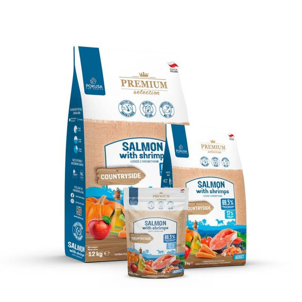 Bezzbożowa, pełnoporcjowa karma super premium stworzona na bazie mięsa z łososia z dodatkiem odżywczych krewetek oraz składników “superfoods” takich jak polskie jabłka, suszona dynia, jagody i olej z łososia.