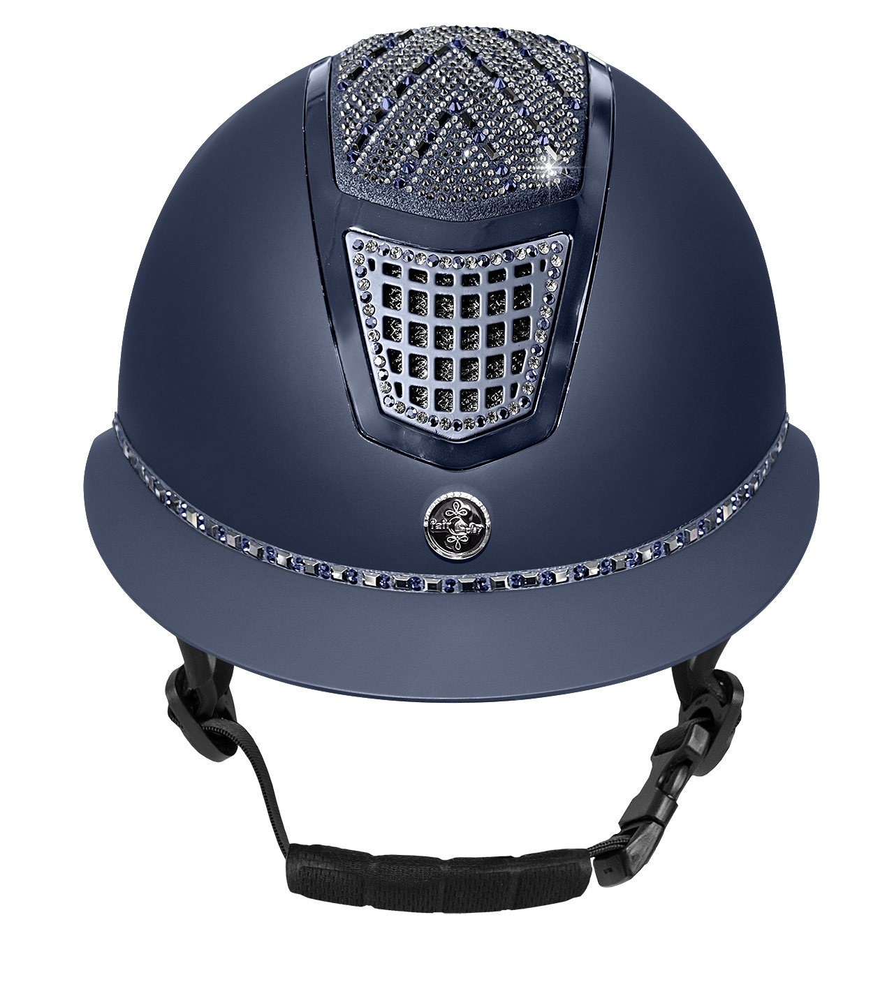 Model Quantinum 2.0 Supreme Matt to kask o wyrazistym, nowoczesnym charakterze: gładka, matowa skorupa kontrastuje z mocno błyszczącym, bogato zdobionym topem z kryształkami. Całości dopełnia lamówka z kryształków na linii mocowania daszka, tworząc efekt, który od razu przyciąga wzrok.