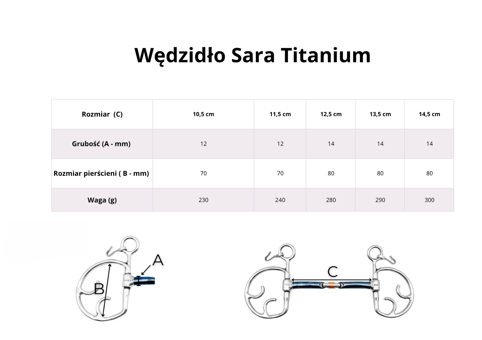 Anatomiczne wędzidło proste wykonane z lekkiego tytanu, stworzone z myślą o koniach potrzebujących stabilnego, a zarazem delikatnego kontaktu. Jego specjalistyczny kształt został zaprojektowany tak, by jak najlepiej odwzorować naturalne kontury końskiej jamy ustnej, co pozwala na równomierne rozłożenie nacisku i znaczną poprawę komfortu użytkowania. W przeciwieństwie do klasycznych prostych wędzideł, Sara oferuje nie tylko stabilność, ale również subtelność działania i znaczną ulgę dla języka.