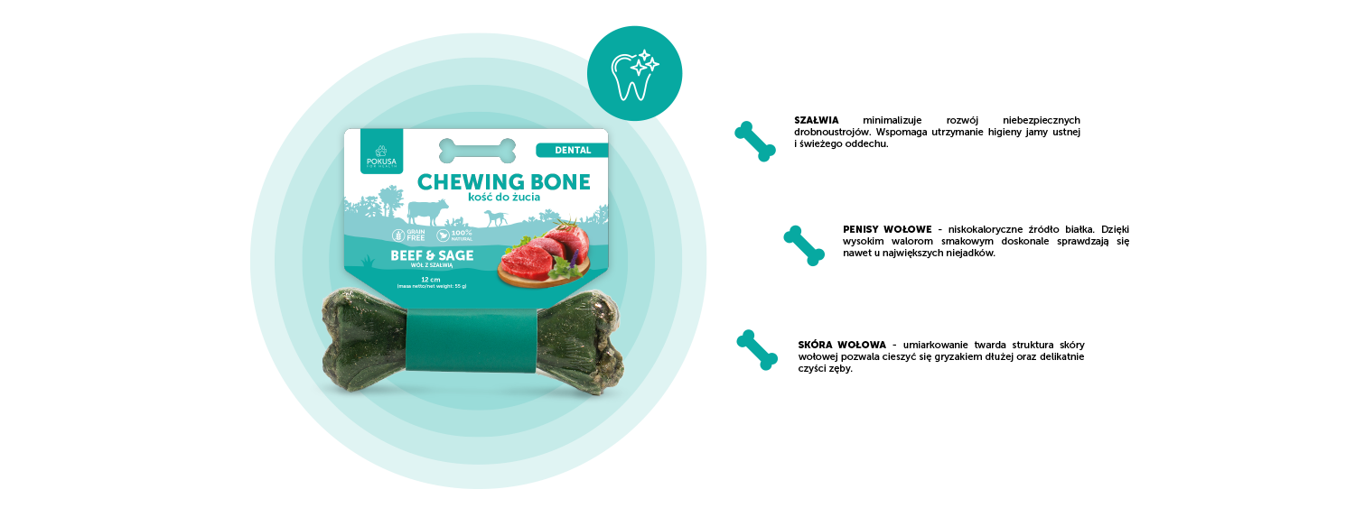 Dobór poszczególnych składników kości do żucia dla psa został dokładnie przeanalizowany i dobrany tak, by dostarczyć Twojemu psu najlepszych wartości odżywczych, jednocześnie zapewniając wysoką smakowitość produktu oraz zaspokoić najważniejsze potrzeby psiej natury.