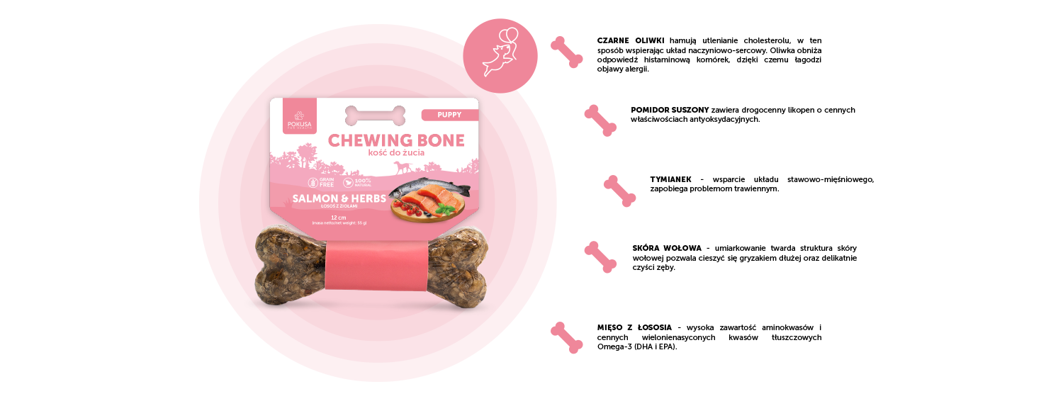 Dobór poszczególnych składników kości do żucia dla psa został dokładnie przeanalizowany i dobrany tak, by dostarczyć Twojemu psu najlepszych wartości odżywczych, jednocześnie zapewniając wysoką smakowitość produktu oraz zaspokoić najważniejsze potrzeby psiej natury.