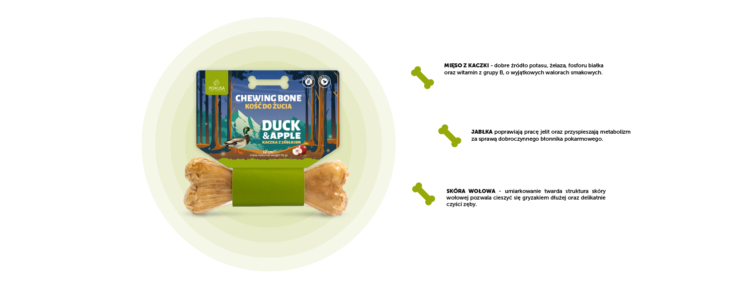 - Kość do żucia wyprodukowana z najlepszej jakości skóry wołowej z dodatkiem kaczki i jabłka.