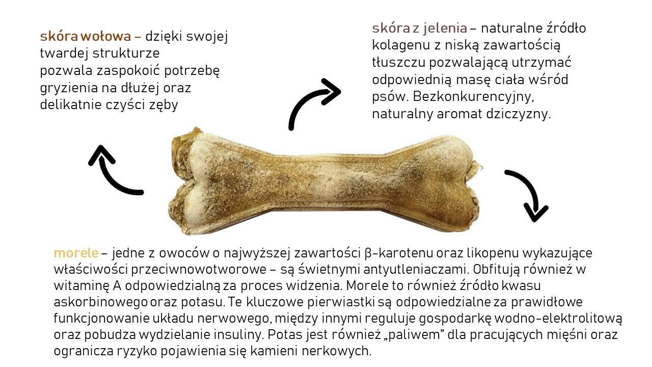 Głównymi składnikami kości są: skóra wołowa, skóra z jelenia oraz morele.