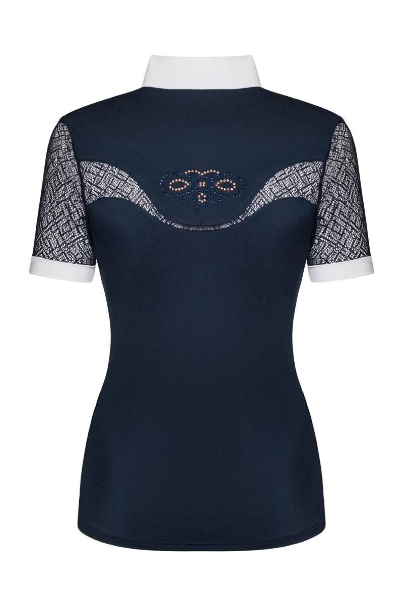 • Elegancka koszulka konkursowa wykonana z elastycznej i oddychającej dzianiny z funkcją UVP. Ozdobiona kryształkami w kolorze różowego złota.