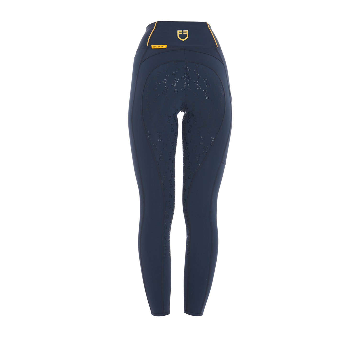 Charakterystyczne logo Equestro na udzie oraz estetyczne detale podkreślają sportowy, elegancki styl legginsów.