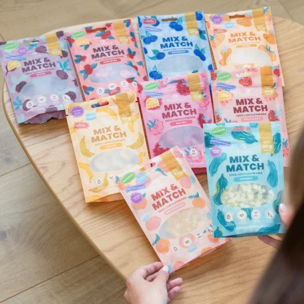 Przysmaki wpisują się w koncepcję MIX & MATCH, która polega na łączeniu różnych liofilizowanych owoców i warzyw w zależności od potrzeb psa. Dzięki legendzie kolorystycznej zamieszczonej w galerii zdjęć, można świadomie dobierać składniki, aby wspierać konkretne funkcje organizmu – na przykład układ nerwowy, trawienny czy odpornościowy.