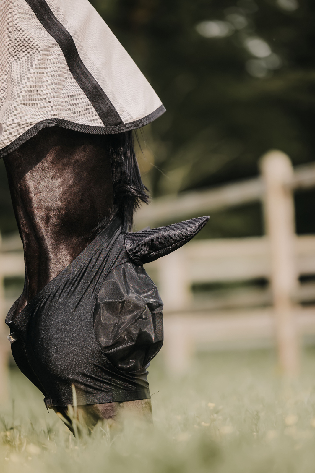 • Maska przeciw owadom, zaprojektowana tak, aby idealnie przylegać do głowy konia i uniemożliwiać nawet najmniejszym owadom dostanie się pod materiał.